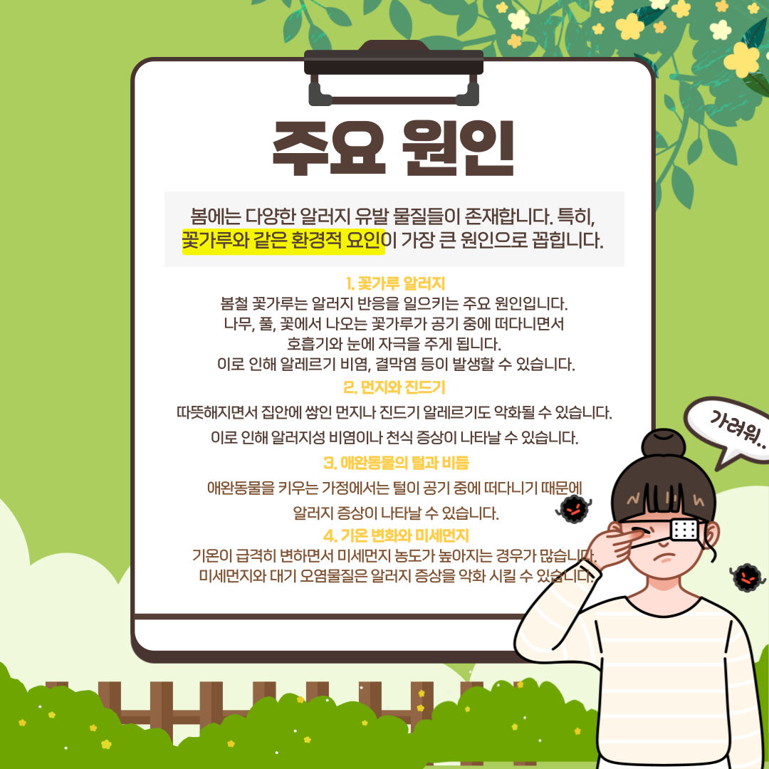 특히 봄철 알러지는 꽃가루와 관련된 알러지 반응이 주요 원인입니다.