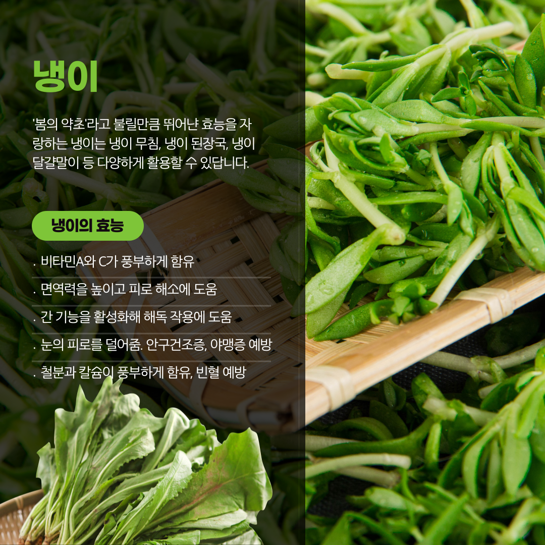 - 냉이에는 비타민 A, C가 풍부하게 함유되어 있어 몸의 면역력을 높이고 피로 해소에 도움을 줘요.